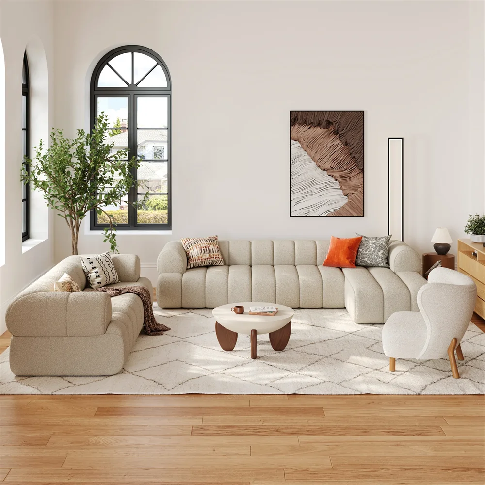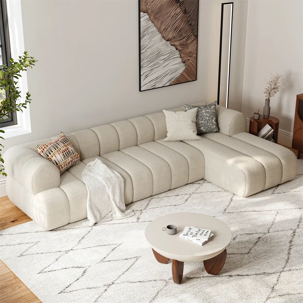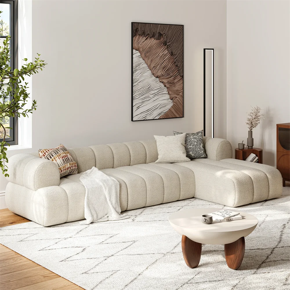 Elevate your living space with Nimbus Modular Sectional Sofa's bold design and indulgent comfort. The L-shaped silhouette blends modern aesthetics with functional versatility, while the ultra-soft boucle fabric offers a luxuriously skin-friendly touch and effortless maintenance. Engineered with high-resilience compressed foam, the sofa ensures optimal support and superior resilience, maintaining its shape through years of use. Sink into deep, plush channel-tufted cushions that cradle you in comfort, perfect for lounging or entertaining.