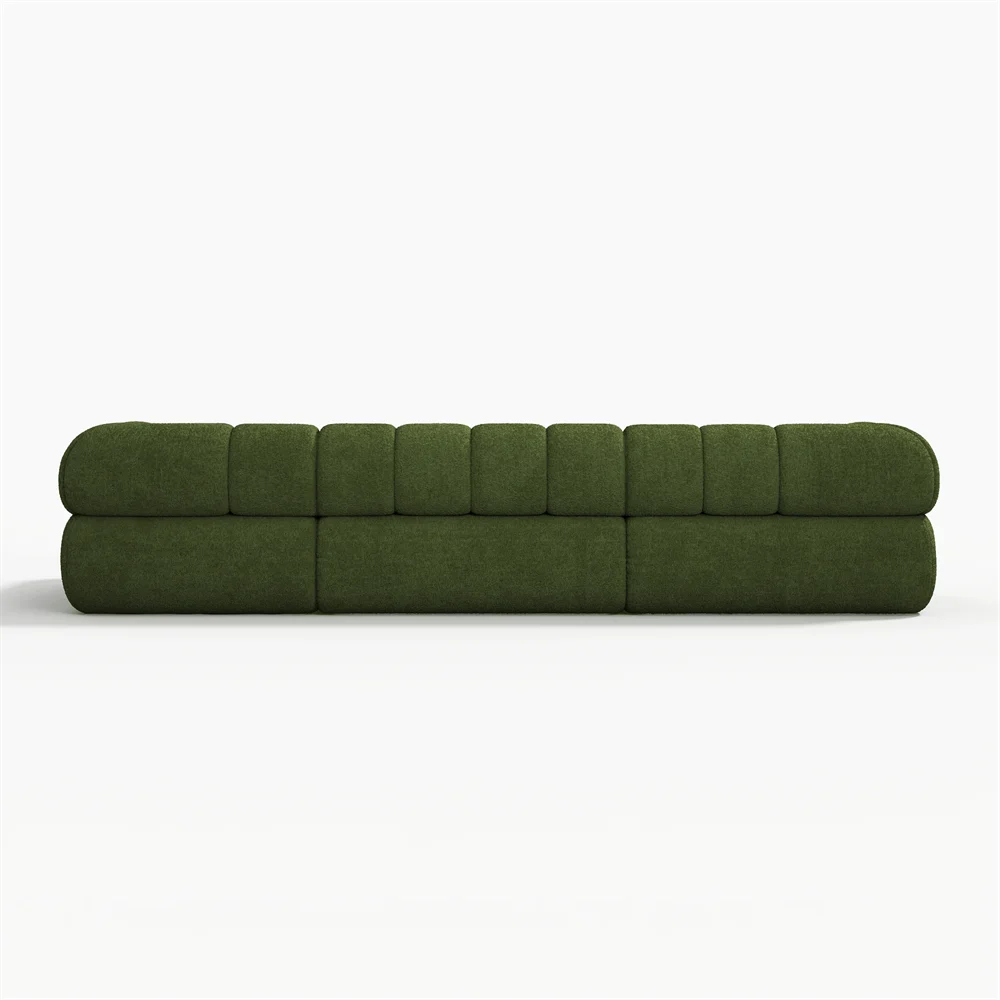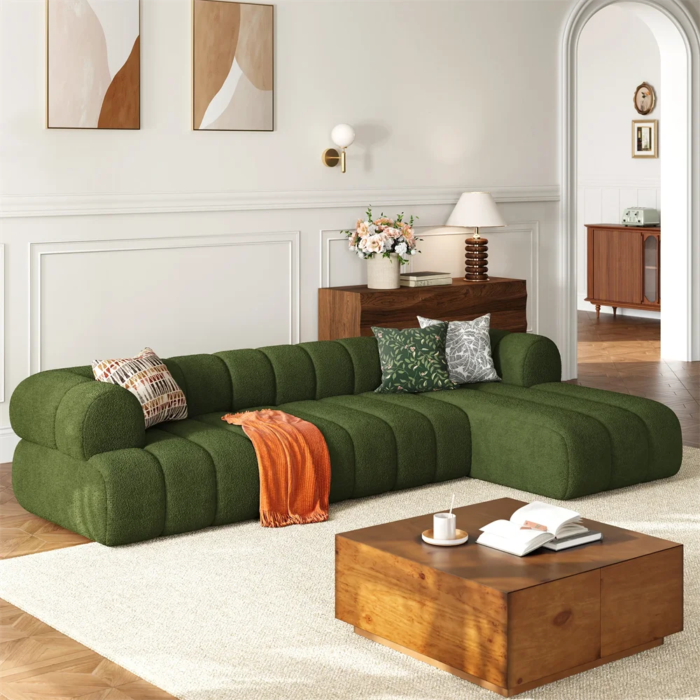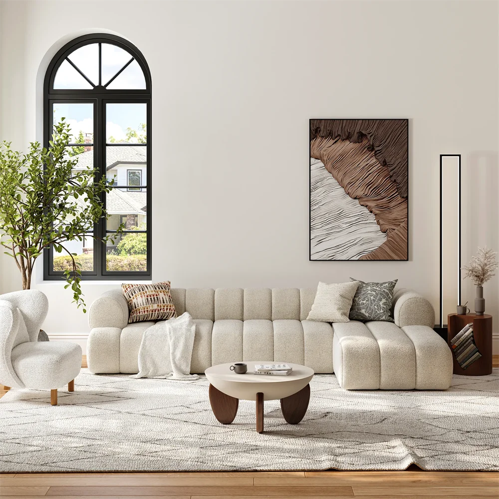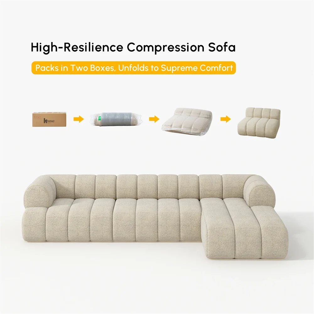 Elevate your living space with Nimbus Modular Sectional Sofa's bold design and indulgent comfort. The L-shaped silhouette blends modern aesthetics with functional versatility, while the ultra-soft boucle fabric offers a luxuriously skin-friendly touch and effortless maintenance. Engineered with high-resilience compressed foam, the sofa ensures optimal support and superior resilience, maintaining its shape through years of use. Sink into deep, plush channel-tufted cushions that cradle you in comfort, perfect for lounging or entertaining.