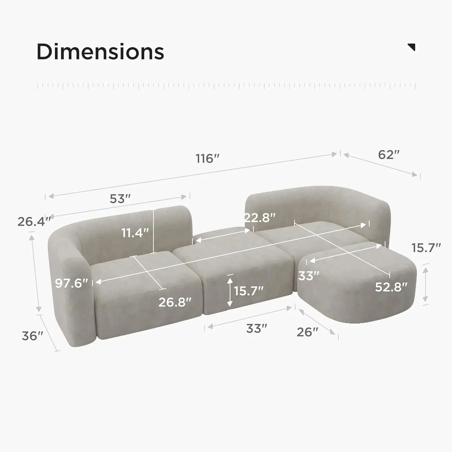Spacious seating - With a capacity of 1200 lbs, this modern reversible sofa set includes a chaise, a right-arm seater and an ottoman, providing spacious seating for up to 4 adults. It measures 116”W x 62”D x 26.4”H.