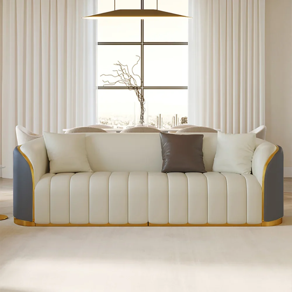 Elegant and stylish, this three-seater sofa will transform any living room into a luxurious lounge. Featuring soft tufting details, this sofa injects multifaceted texture into your overall design scheme. Faux leather upholstery and seating padding with high-density foam add maximum comfort for you when lounging after a long day. Come with the solid wood frame and gold stainless steel base, this sofa delivers sturdy support and durable performance. Lend a touch of luxury in your living room with this sofa.